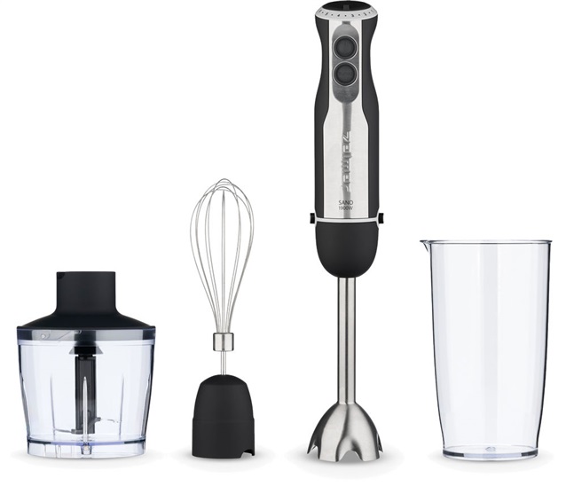 Tyčový mixér 1200W ·Turbo funkce · Odnímatelná nerezová noha · 2 vysoce účinné nerezové nože · technologie proti rozstřiku surovin - Nádoba s odměrkou - sekací nástavec s nádobou vhodný pro sekání ořechů, bylinek, tvrdého sýra, zeleniny a zvládne rovněž led - šlehací nerezová metla
