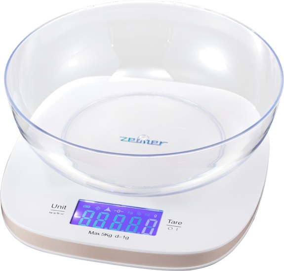 Kuchyňská váha s mísou, Přesnost 1g až 5kg · Podsvícený displej · Hmotnost v g / lb / oz / ml · Funkce TARA umožňuje pohodlně odečíst hmotnost vážené suroviny · Ultra tenký design, lehká a snadno skladná · Automatické vypnutí
